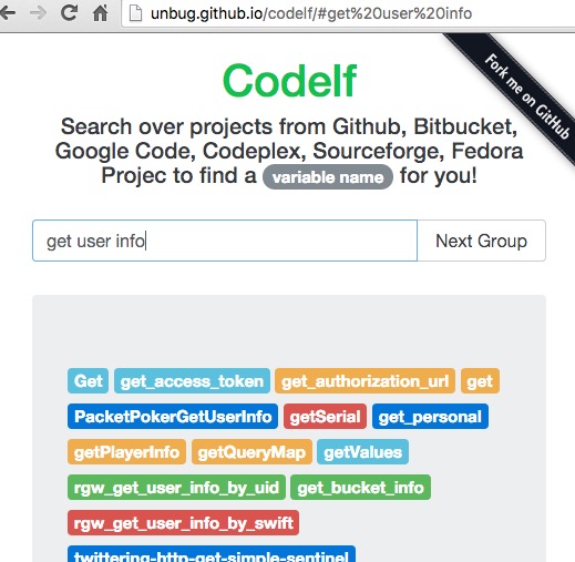 Codelf通過搜索在線開源平臺Github, Bitbucket, Google Code, Codeplex, Sourceforge, Fedora Projec的項目源碼,幫開發(fā)者從中找出已有的匹配關鍵字的變量名。這個搜索服務支持直接搜索中文。codeif支持中文查詢,輸入中文意思,codeif可以根據(jù)需要查詢盡可能滿足需要的結果,并展示與查詢結果相關的支持各種編程語言的代碼片段以及代碼庫。